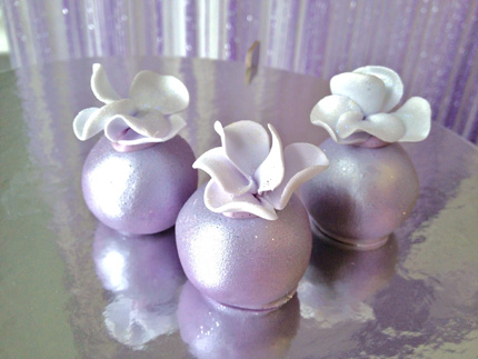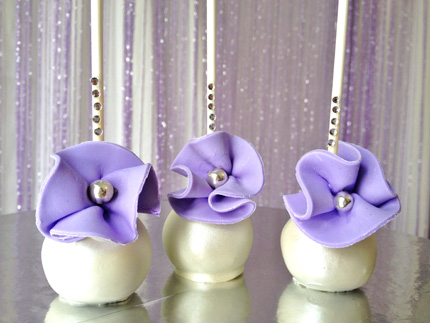 “'Mauve'alicious Sweets' This dessert table was sweetly filled with ~ Ruffled Blossoms Cake Pops (with and without the sticks) ~ Frilled Heart Cookies ~ Ruffled Blooms Cupcakes ~ and a Sweet Pleats White Chocolate Cake”.