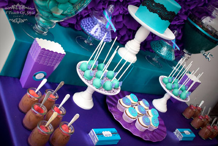 “I recently styled a dessert table for my 30th Birthday. I wanted something colourful and vibrant as the theme, along with a little bit of style! So I decided on purple party supplies matched with accents of black lace. I started off by creating a gorgeous purple wide format backdrop made entirely of crepe paper, and coordinated it with purple and teal satin table linen. Guests enjoyed some of my party sweet treats including macarons, cake pops, chocolate mousse and cupcakes!