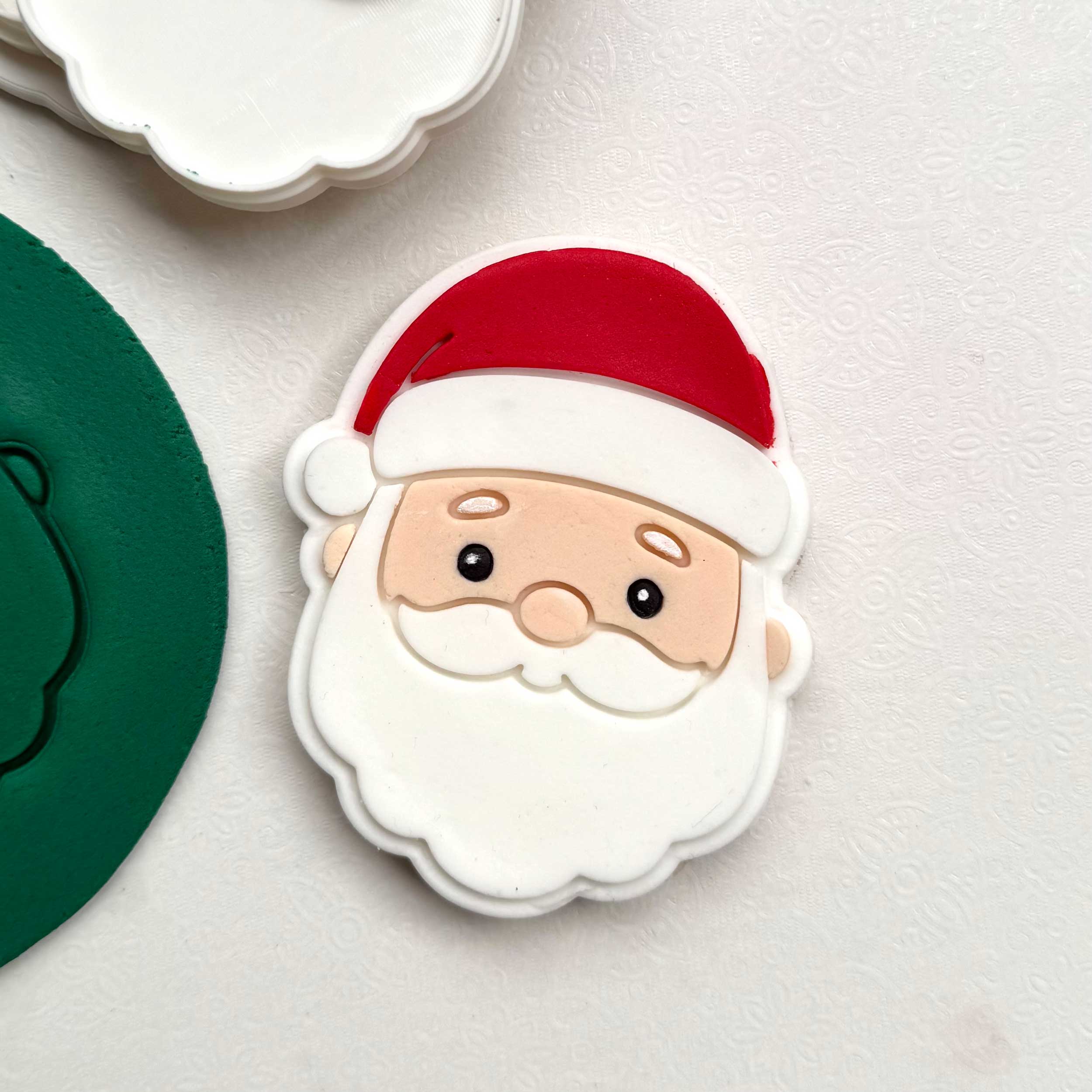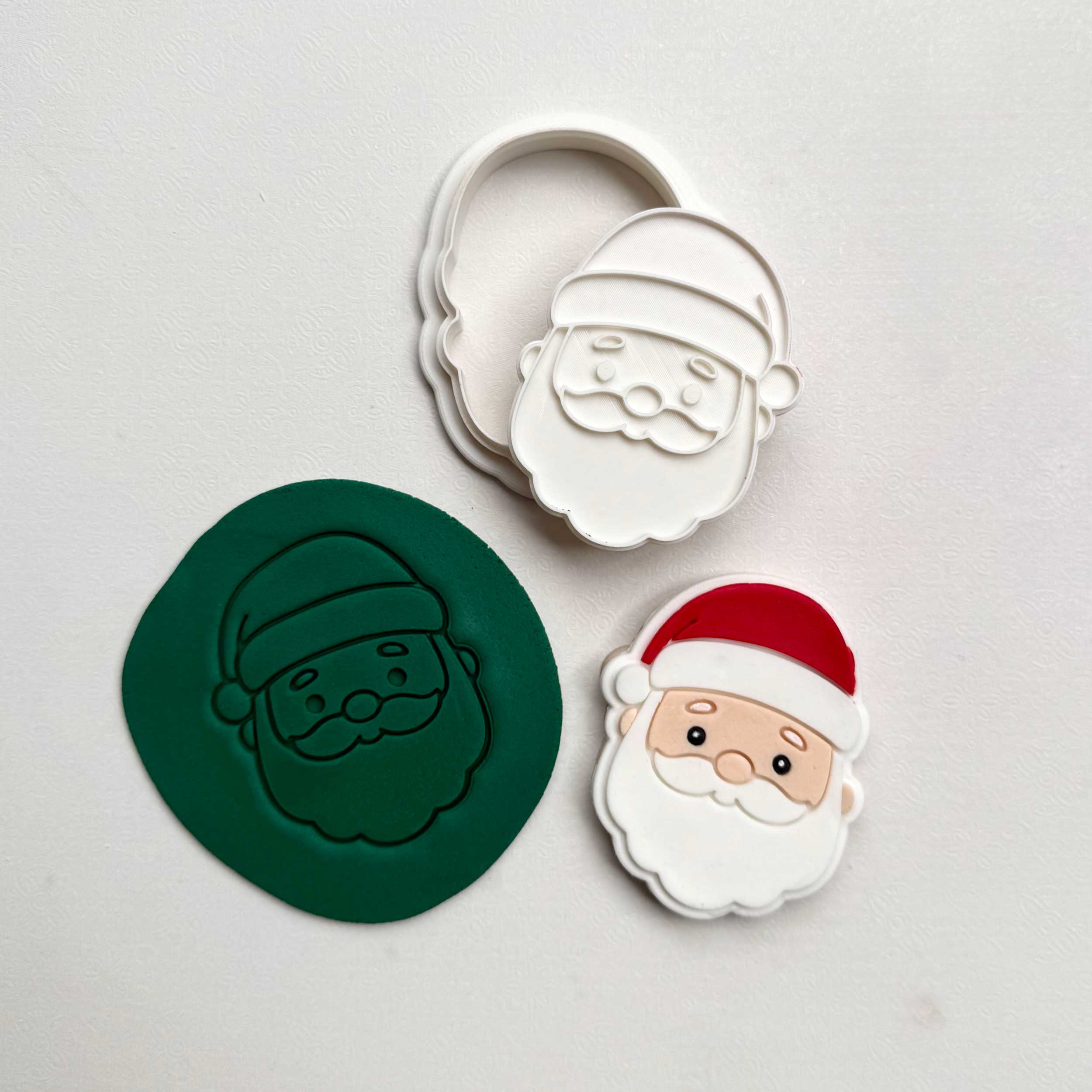 Each piece is 3D printed in-house using durable materials to ensure crisp, consistent detail with every use. The debossed finish creates neat indented lines that make decorating simple and satisfying — no matter your skill level. The matching cutter ensures perfect outlines for Santa’s jolly face every time.