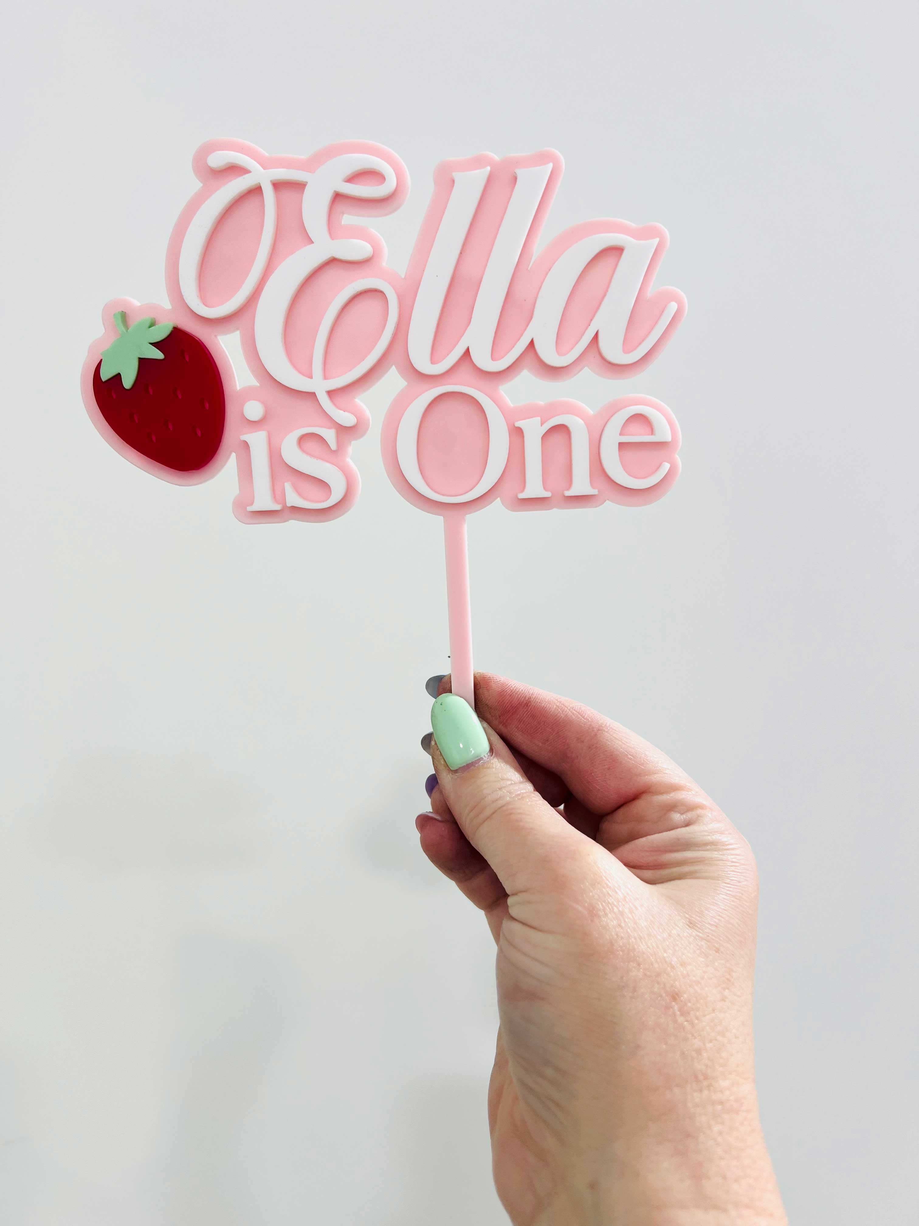Sweet, simple, and oh-so-pretty – this strawberry-themed cake topper adds a fruity touch of fun to any birthday cake. Featuring your little one’s name and age in pastel pink and white layers, it’s finished with a cheerful red strawberry accent that makes every cake look extra special.