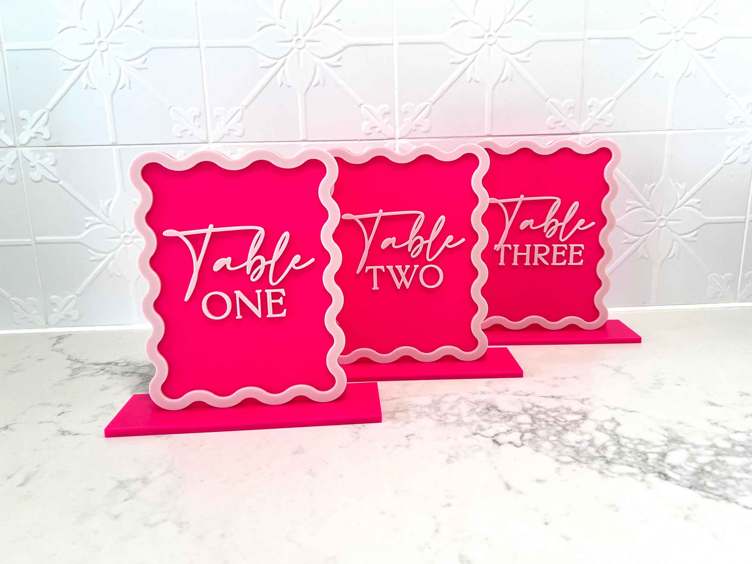 Elevate your event with a touch of sophistication with our Wavy Table Numbers, where style meets practicality. These chic table markers are designed to stand out with their 3D pop, thanks to the acrylic numbers affixed to a vibrant background. You have the power to customize the look to align with your event's theme by choosing from an array of color combinations for the text, border, and base. Whether it's a wedding reception, a birthday celebration, or a corporate event, these signs add a modern and playful twist to your tablescapes.