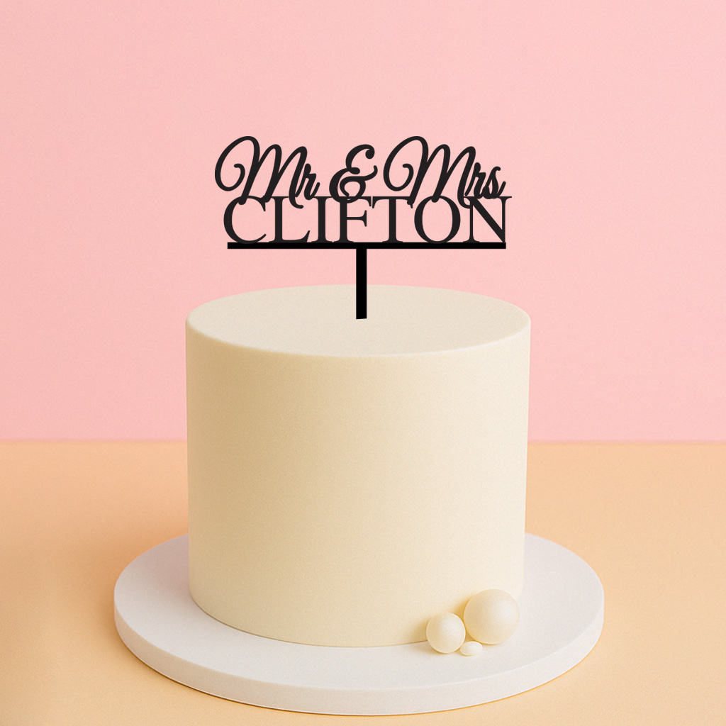Crafted from high-quality acrylic and precision-cut to feature your shared surname, I bring timeless style and a personal touch to any cake. Whether your theme is rustic, romantic, luxe or minimalist, I work beautifully with all kinds of wedding styles and cake designs.